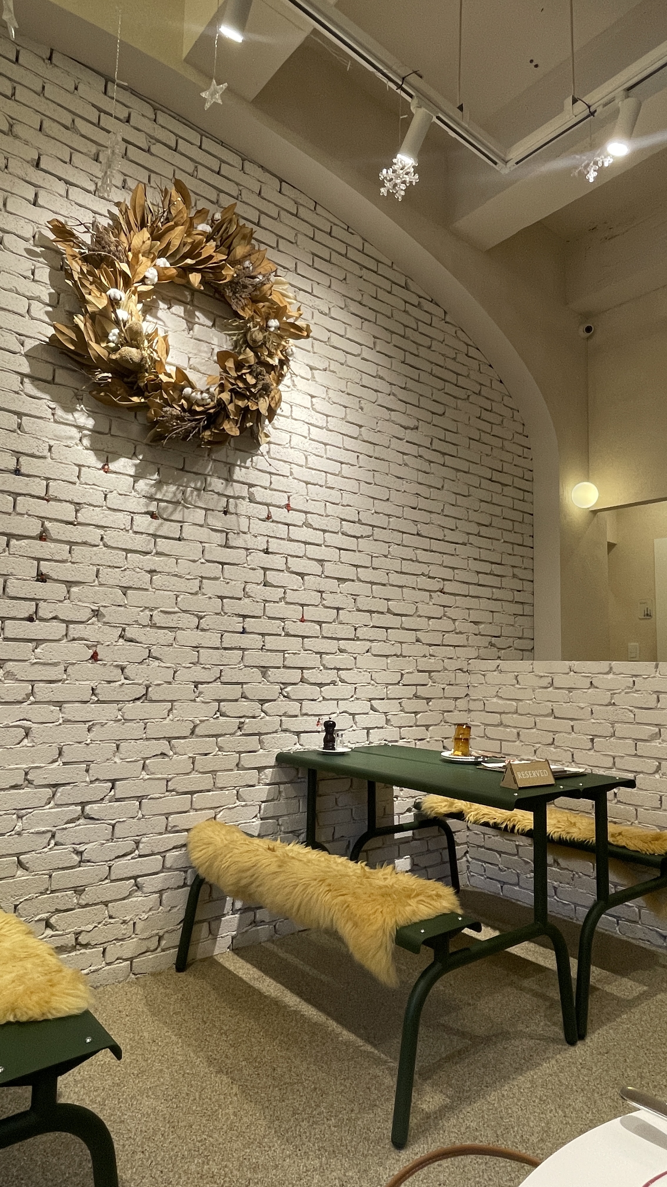 그레이 톤의 벽돌과 어두운 그린 색상의 식탁의 조화가 한층 분위기를 끌어 올리더라구요!